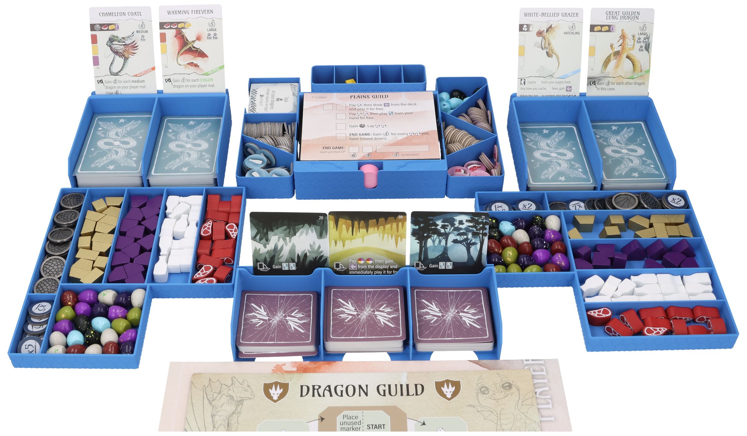 - Larger game components, such as the Dragon Guild Board, Guild Tiles, Card Display and Tracker Boards, Player Mats, Score Pad and rulebooks are placed on the plastic inserts.