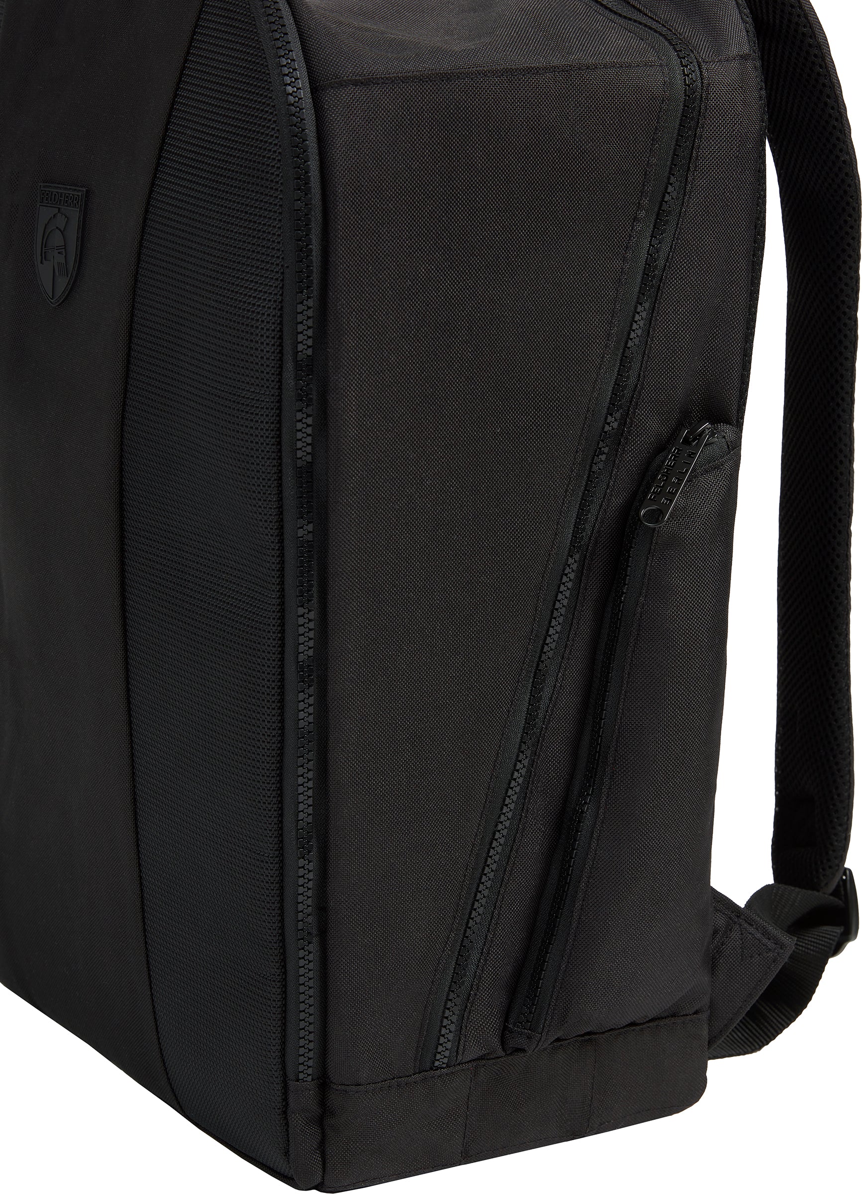 The Backpack is made of light-weight yet durable materials and features a breathable mesh padding. To simplify loading and unloading of the Backpack, the zipper opens wide to three sides. Thereby, the bag can be opened almost completely. The bottom and back are reinforced with PVC inserts for additional protection.
