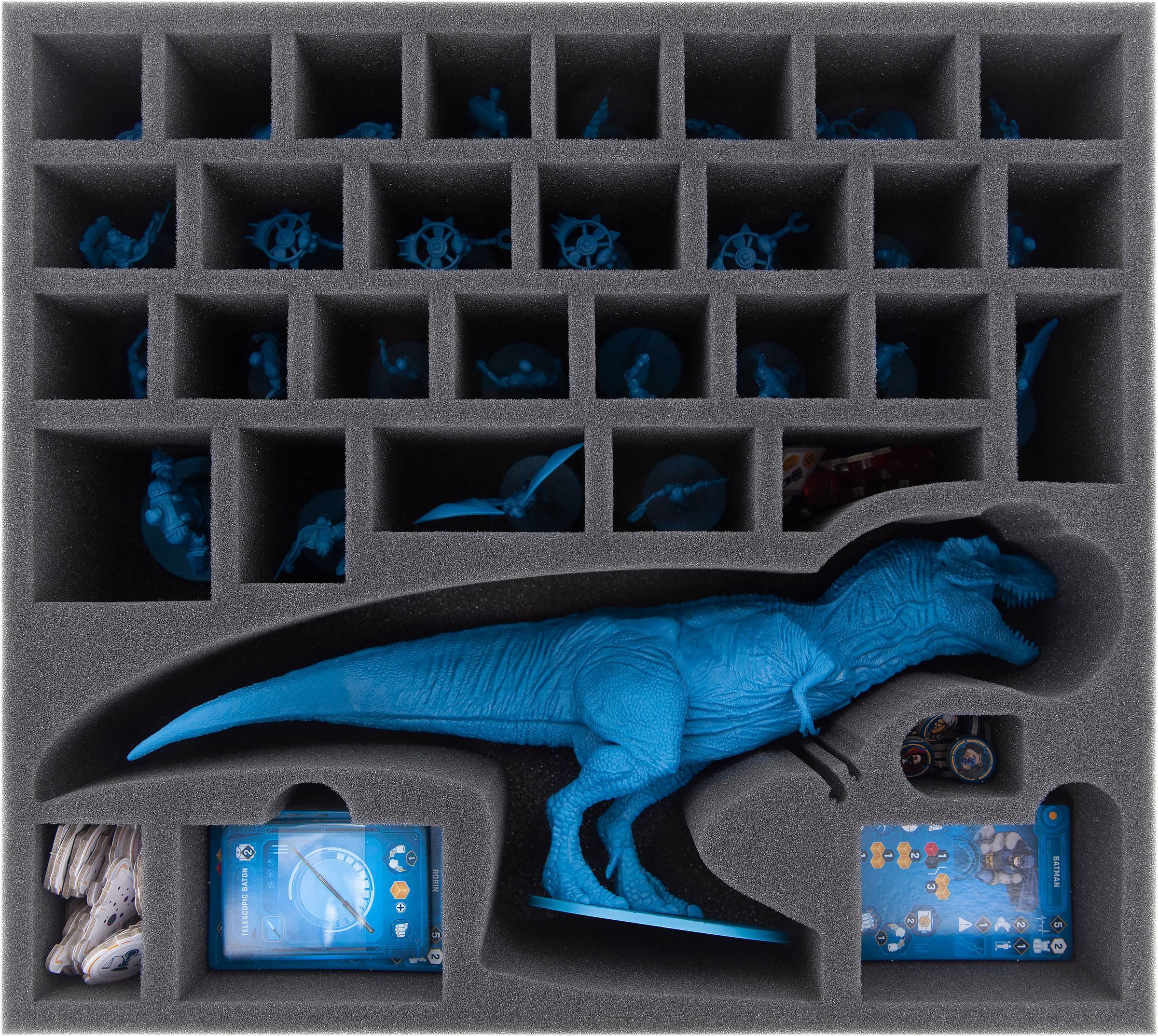 Batman and his allies are all assigned tailor-made compartments. Each figure lies, surrounded by soft foam, in its own compartment and is thus optimally protected against damage. And it is not to be overlooked, in which compartment you put the gigantic T-Rex.