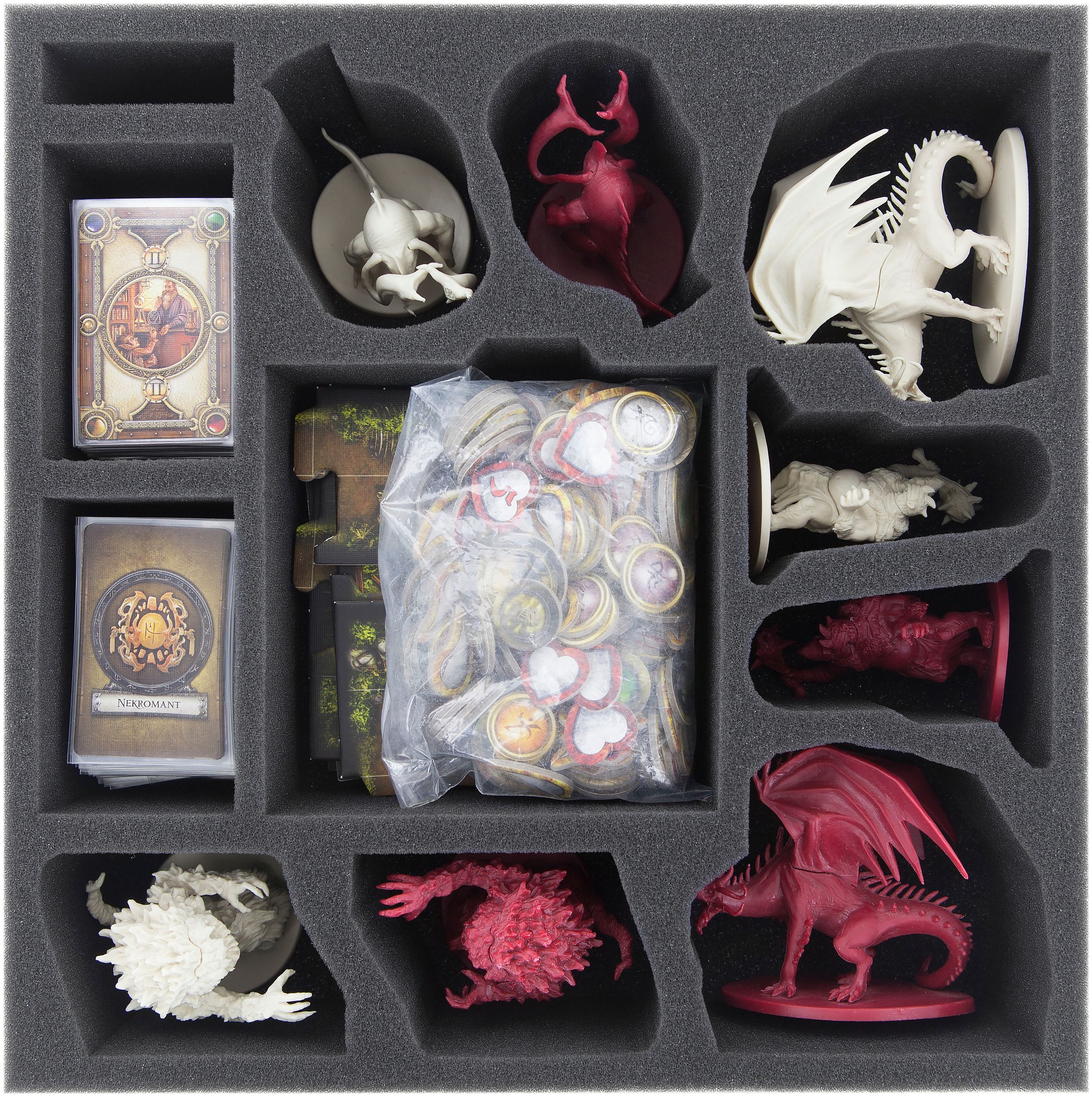On the first floor, the larger eight Monster Figures get their place. These can be placed either lying or standing in compartments that are exactly tailored to fit them. In the middle of the foam tray is a large compartment for map tiles and tokens. In two further compartments small sized (sleeved) cards, such as class or market cards, can be sorted.