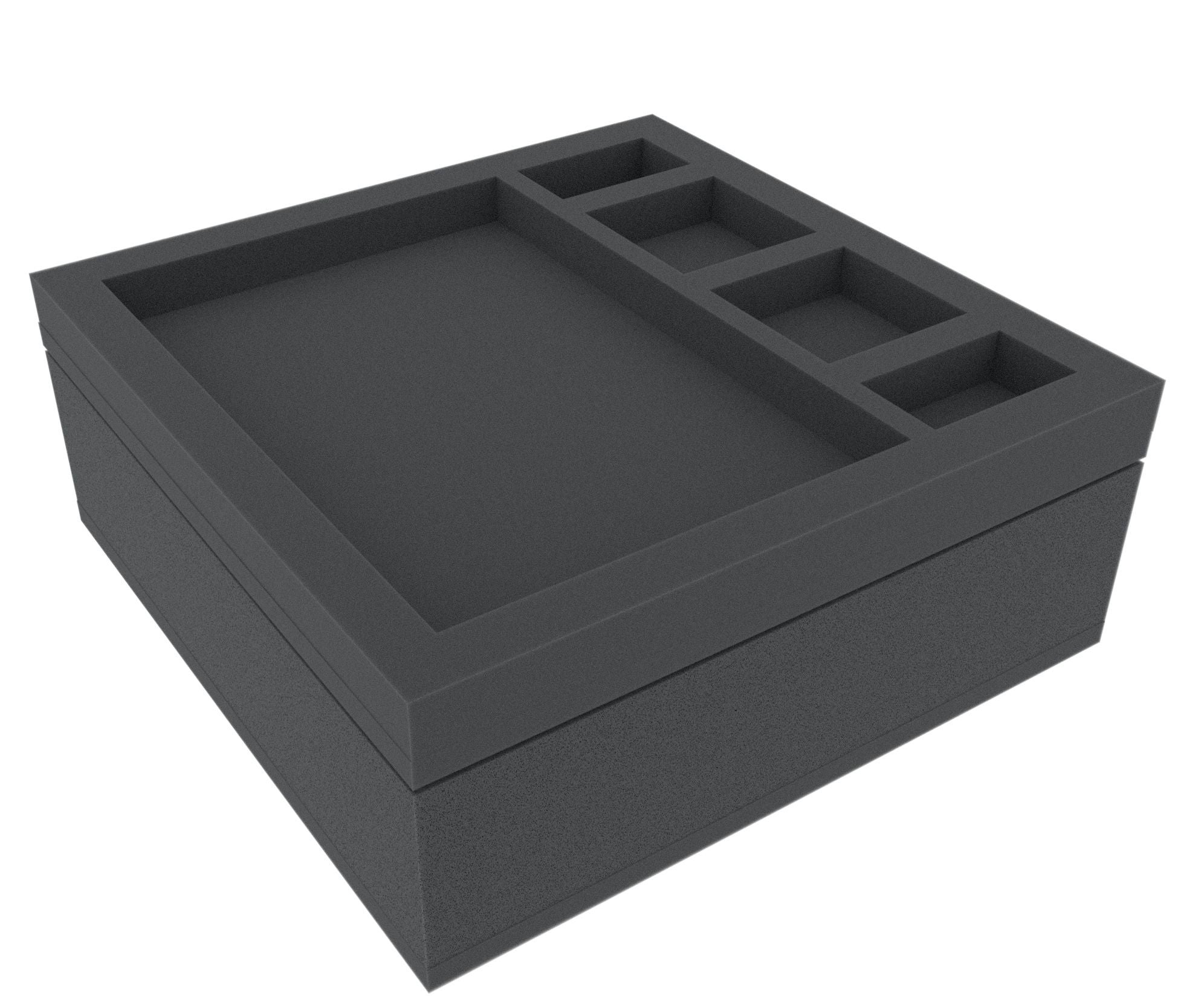 The set consists of three foam trays (dimensions: 285 mm x 285 mm and 40 mm, 70 mm and 30 mm height) and one foam topper. We do only use high-quality, chlorine- and acid-free foam as material. The mats are divided into individual compartments in which miniatures and game components can be sorted quickly and easily. The miniature adjusted cutting of the compartments prevents the more sensitive parts, such as weapons, claws or wings from bending. The separation of the figures by foam dividers provides optimal protection for painted figures and protects the colors from flaking off.
