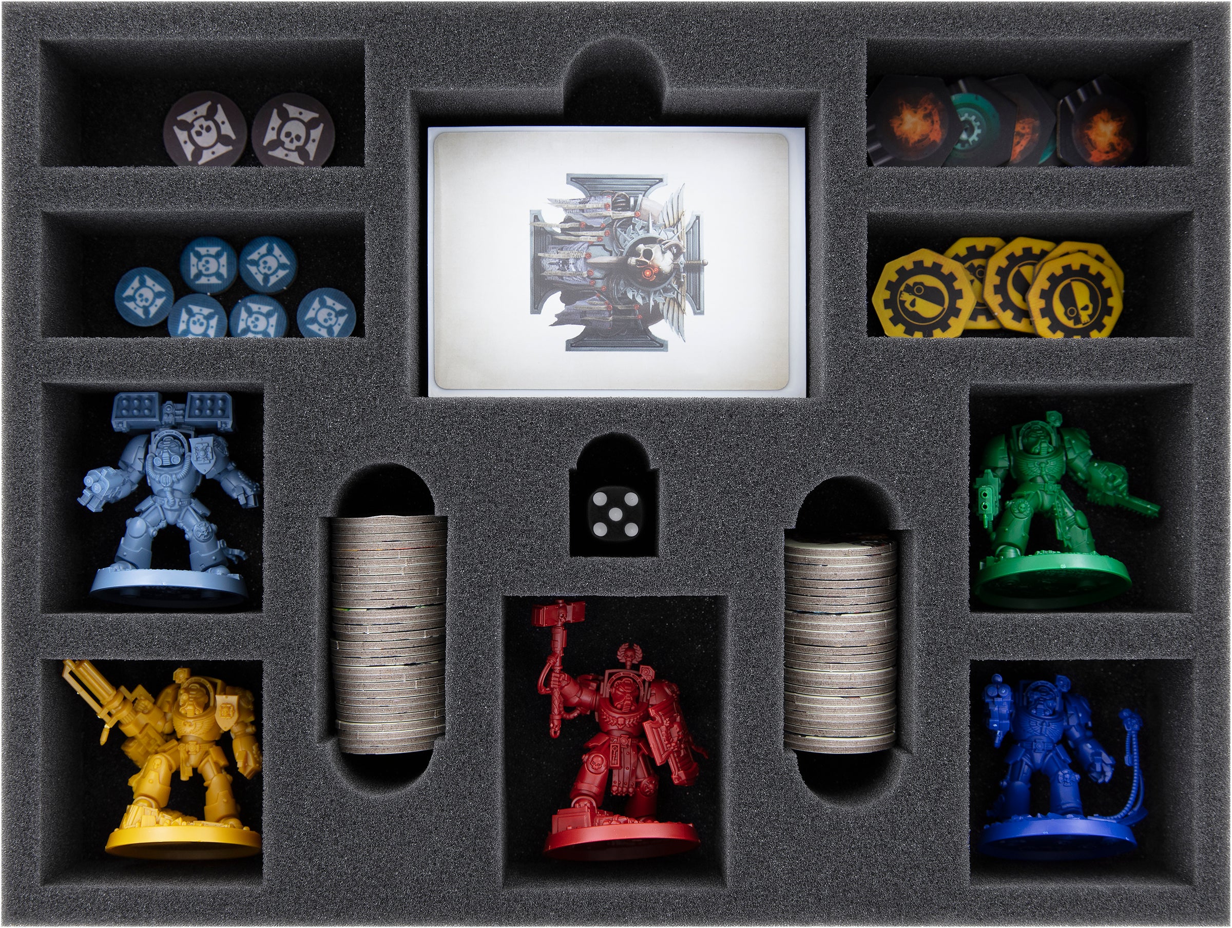 For the miniatures you have 5 precisely cut compartments at your disposal. These are tailor-made for the figures of the Terminators. The soft foam material protects Lucian's Servo-skull just as reliably against bad surprises as the bolters of his brothers. Flaked or scratched acrylic paints on painted models are also a thing of the past.