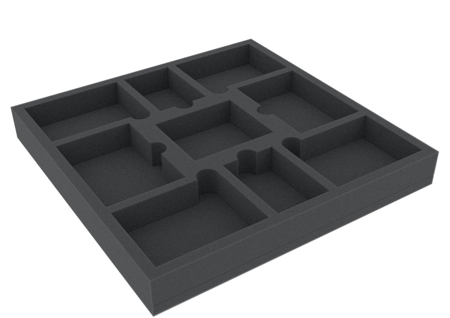 Foam tray number two takes care of the cards. A total of 6 compartments offer enough space to store all cards clearly arranged. The compartments are provided with finger-wide recesses to make it easier for you to remove the stacks. All cards also fit with sleeve.