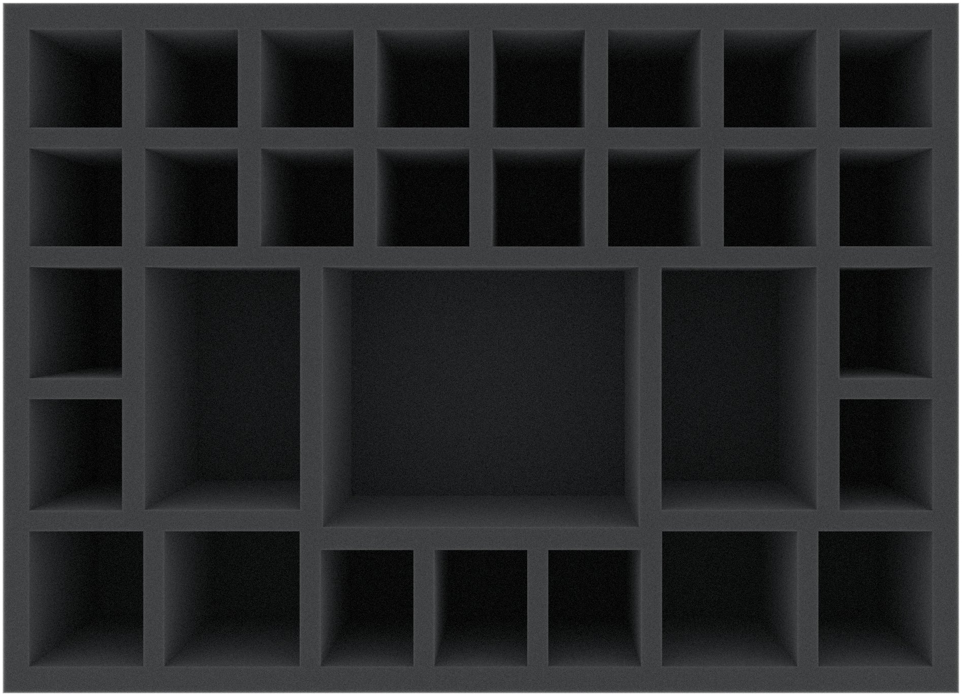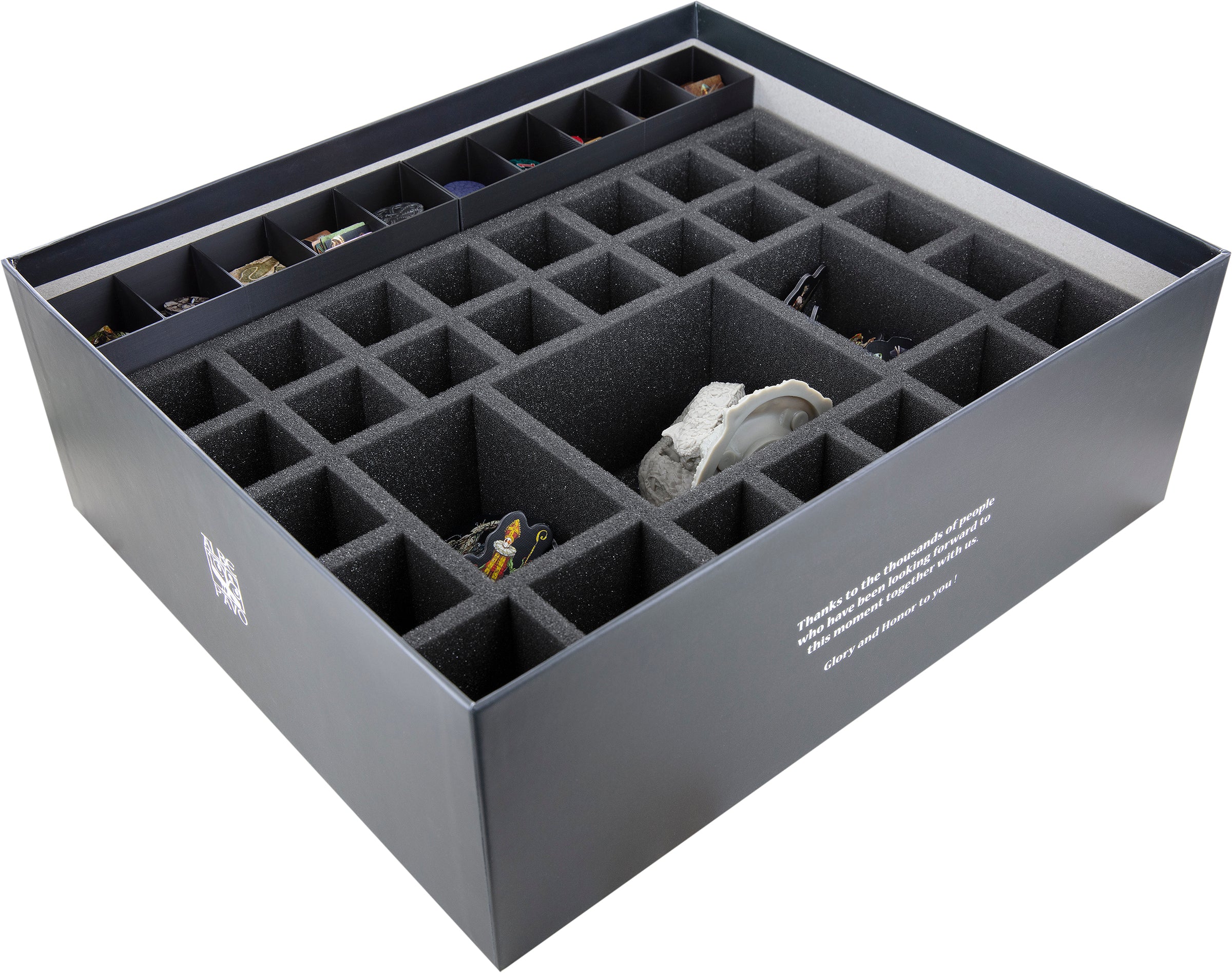 - 1 Feldherr foam tray with 30 compartments for miniatures like character minis, enemy minis, and Tarantasio, for character standees, as well as for small game material like obstacle tiles and fortification tiles