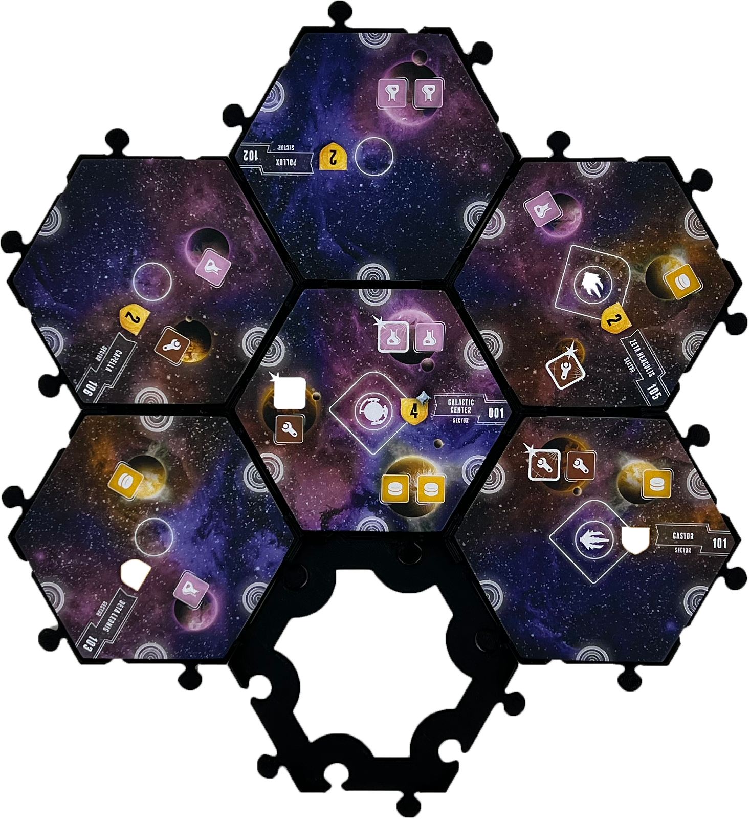 The Sector Hex tile holder for "Eclipse: Second Dawn for the Galaxy" is available as a set in the following variants: