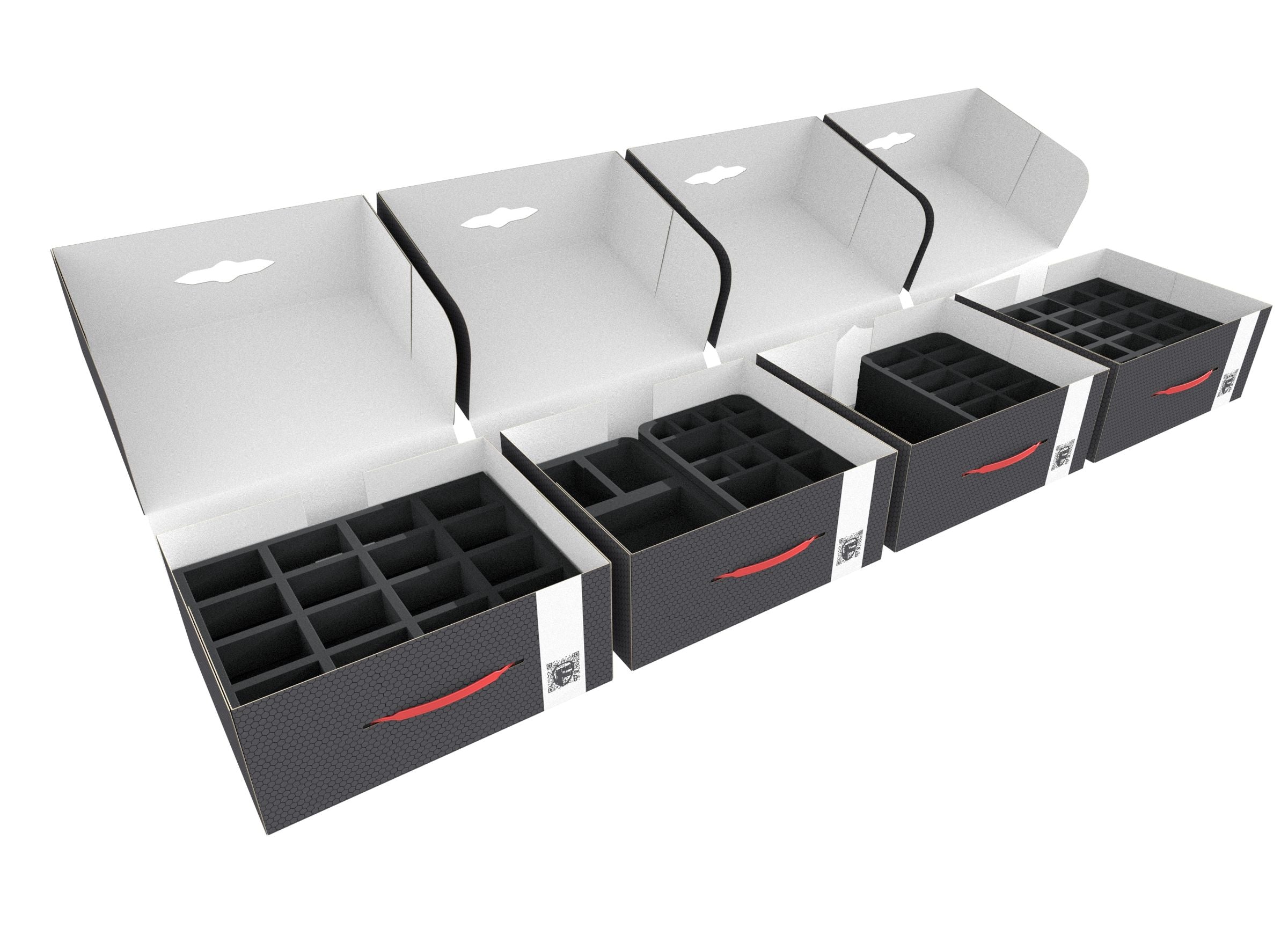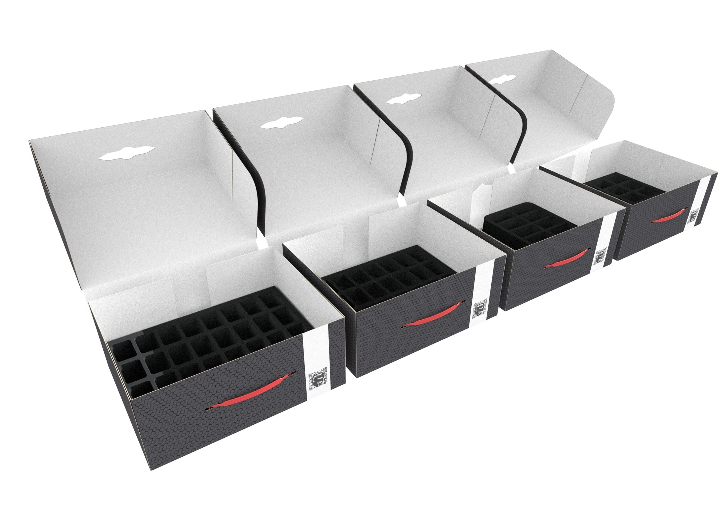 2 Full-Size and 2 Half-Size foam mats are ideal for Unit Box miniatures. So you can individually enlarge your armies and have all the characters and troops you need for the game stowed compactly and ready to travel in the transporter.