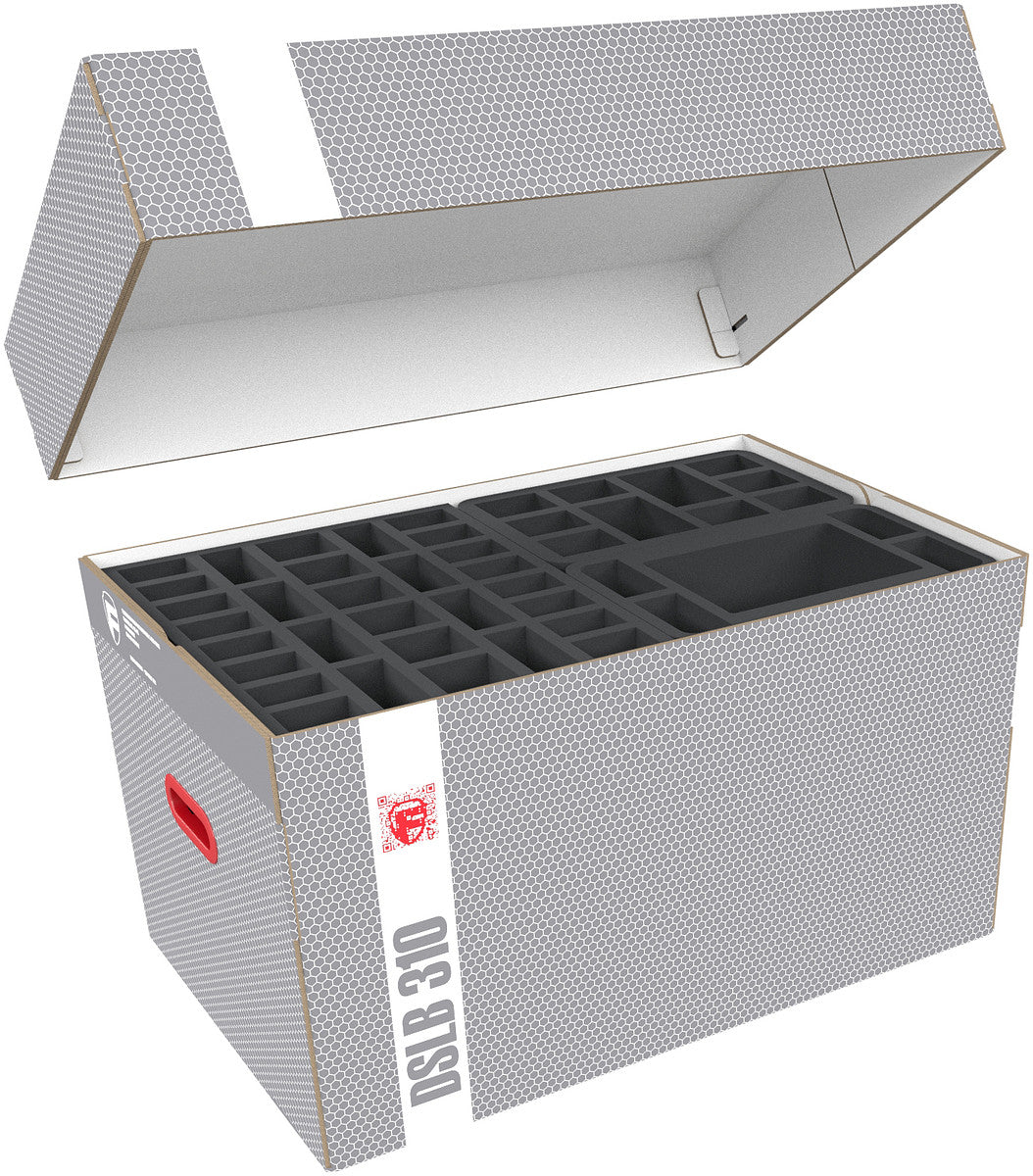The Storage Box DSLB310 is made of coated, corrugated cardboard. This makes it not only pleasantly light but also very tear-resistant and stable. The attachable lid reliably protects the contents from dust and other external influences. With the appropriate foam trays, miniatures, game material, and all other goods can be stored safely — and conveniently transported with the two plastic-reinforced carrying handles on the sides.