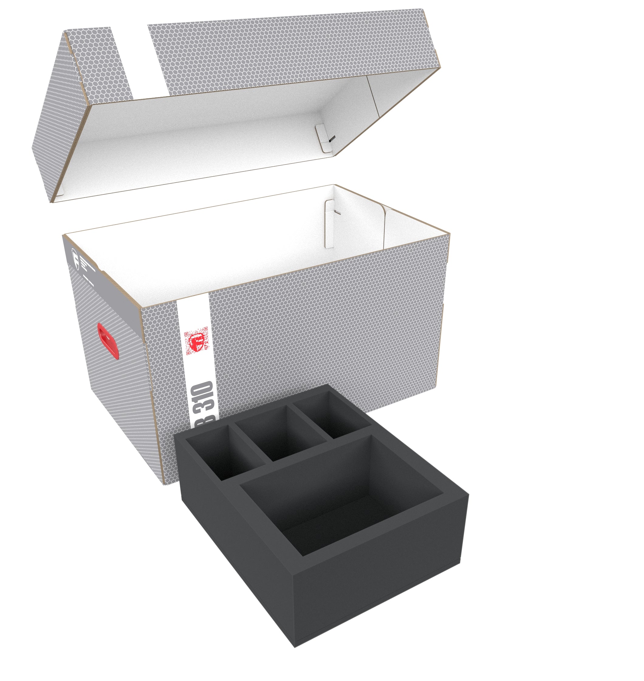 All these foam trays are stacked inside the high quality Storage Box DSLB310. It is made of coated, corrugated cardboard. Making it not only pleasantly light, but also particularly tear-resistant and stable. Your models can thus be stored safely and dust-protected.