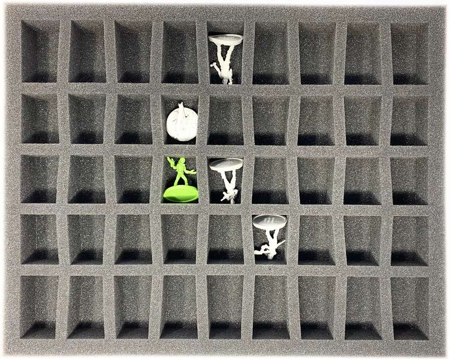 On this Feldherr foam tray you have space for up to 45 Fallout: Wasteland Warfare miniatures. The insert is especially suitable for storing miniatures on 30 mm base and similar sized models.
