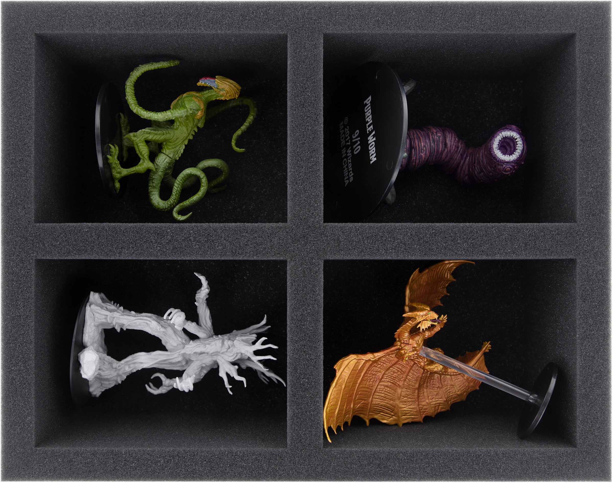 The insert is especially suitable for most WizKids D&D miniatures in the size Huge. Of course the Dungeons and Dragons figures in 25/28 mm scale from other manufacturers (e.g. Reaper, GF9) are padded softly here as well.