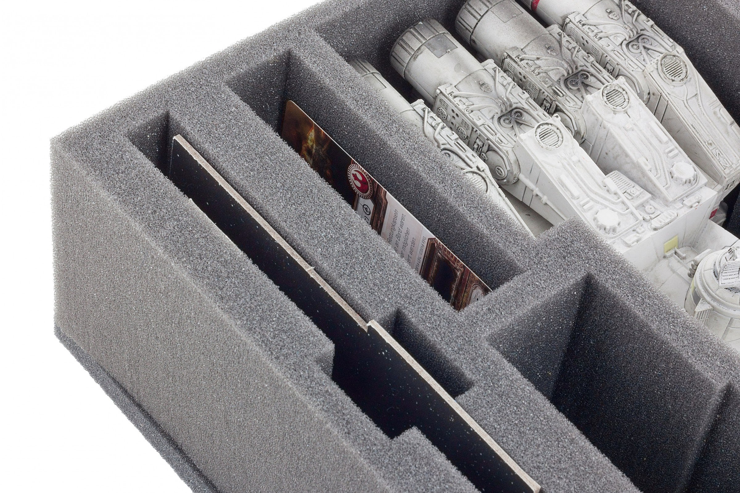 Especially for the Star Wars X-WING Tantive IV (CR90) tailored foam tray. In this contribution not only to the Star Wars X-WING Tantive IV (CR90) takes place safely, but also the accessories, such as bases, tokens, stand and there is still room for X-Wing space ships like the HWK-290, Tie Fighter and others.