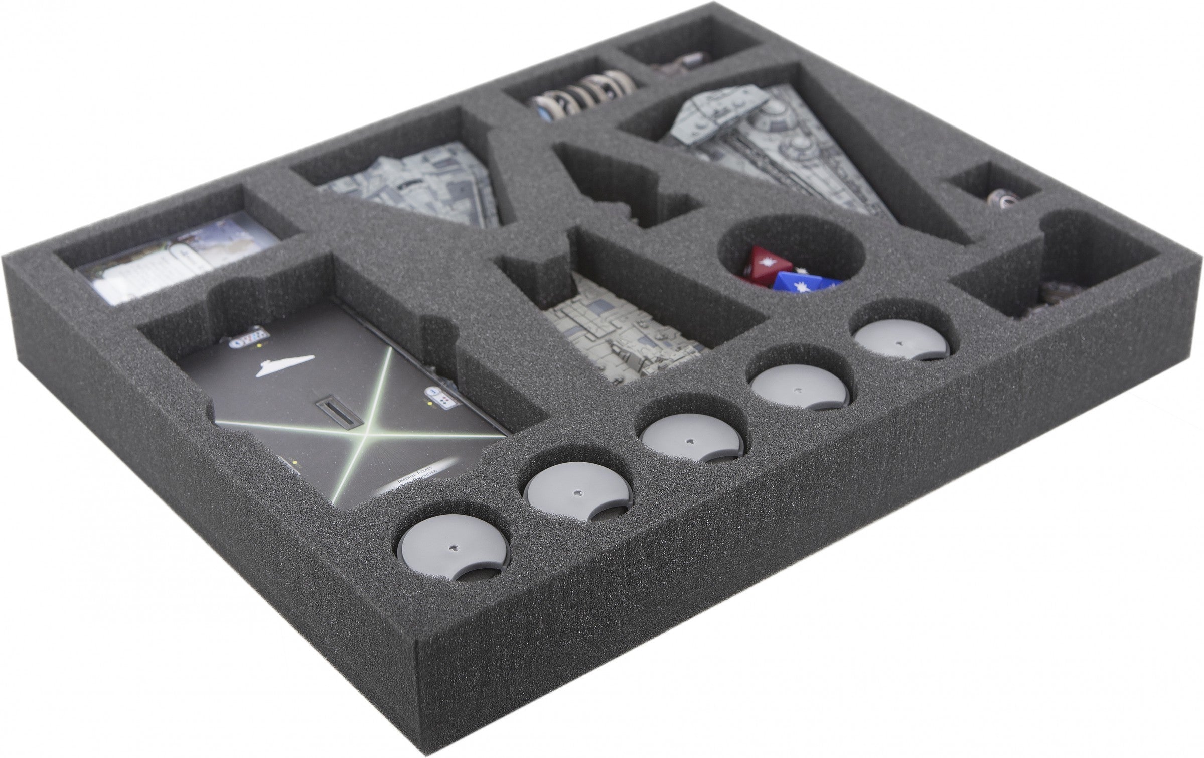 With these foam tray your Imperial units are save. The mat fits exactly for the following miniatures and equipment: Interdictor, Gladiator-class Star Destroyer, Imperial Light Carrier, Imperial Light Cruiser, bases, cards in sleeves, token, Commando and Speed Dials as well as individually usable compartments. So you keep your Imperial fleet safely together.