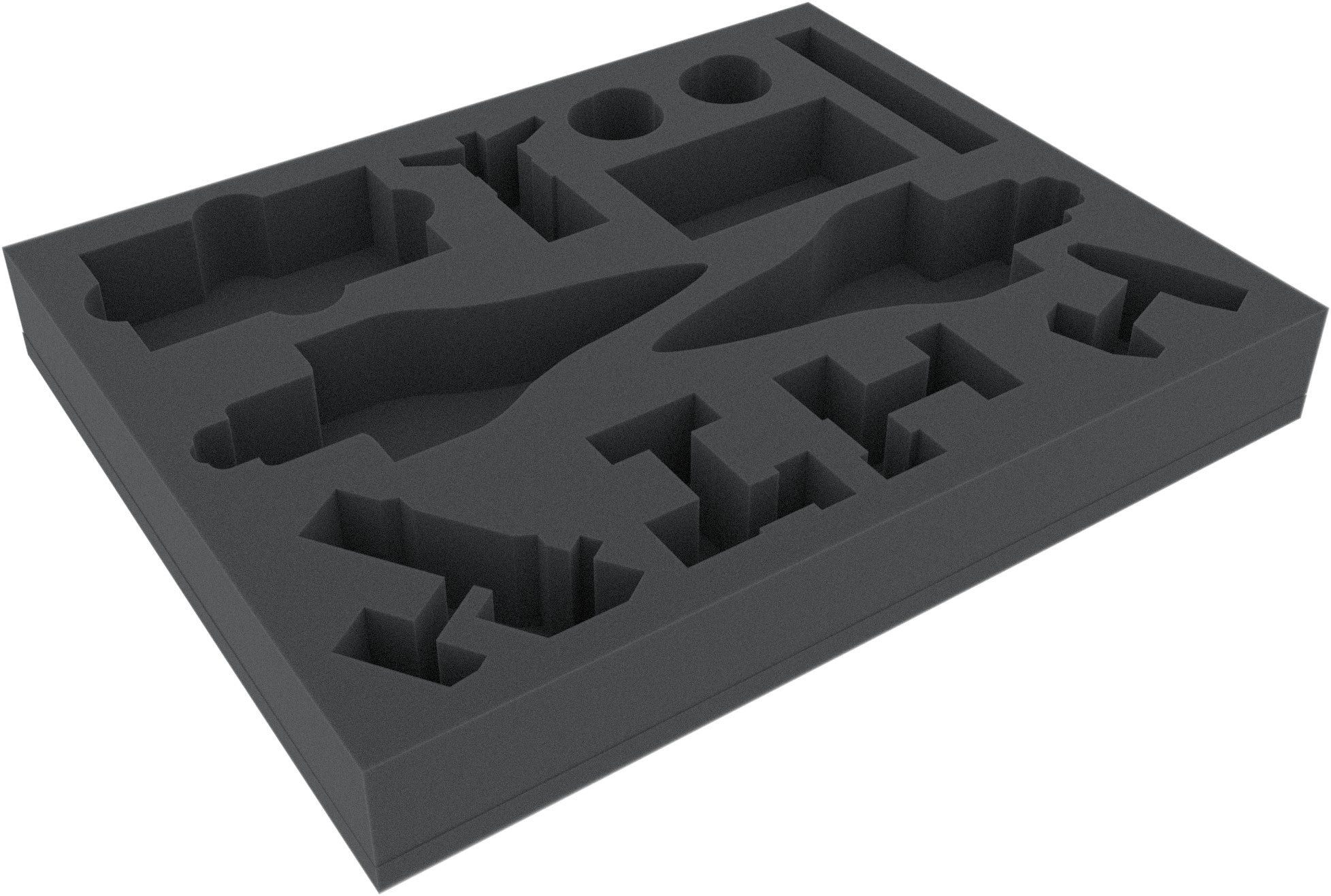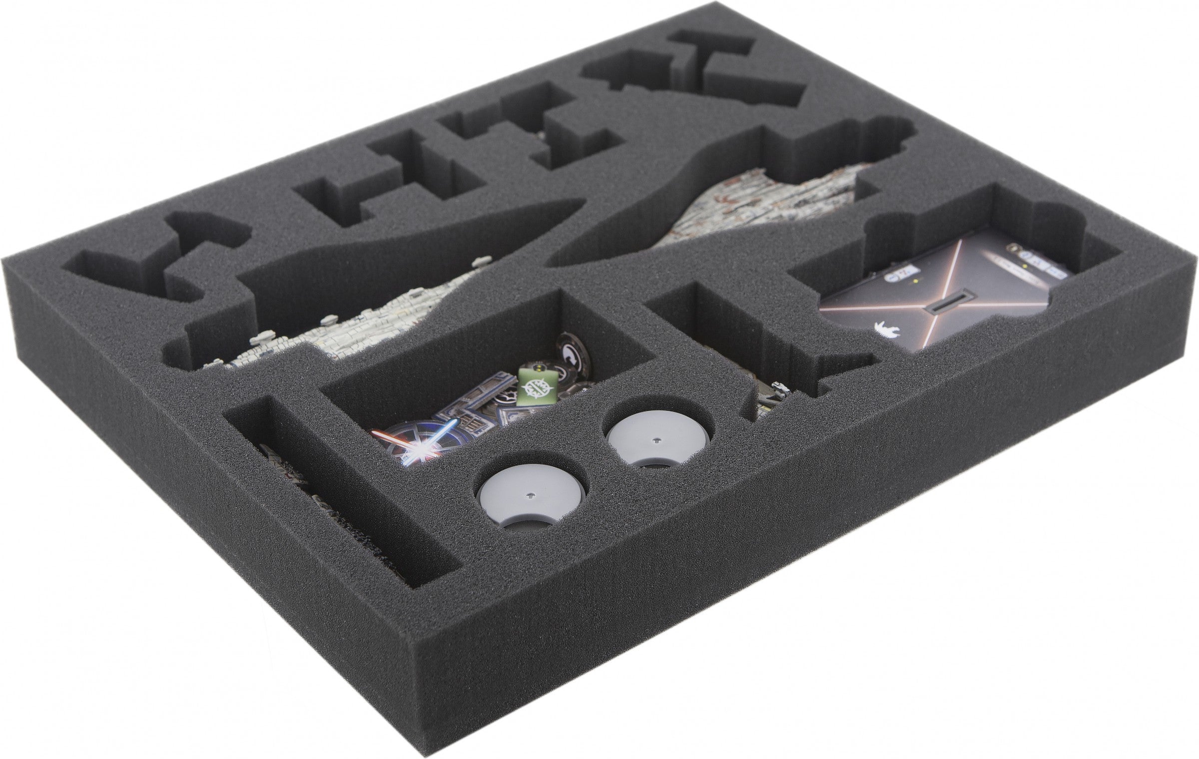 With these foam tray your Rebel units are save. The mat fits exactly for the following miniatures and equipment: MC80 Assault Carrier, MC80 Battle Cruiser, Nebulon-B Escort Frigate, Nebulon-B Support Refit, Phoenix Home, MC30c-Torpedo Frigate or MC30c Scout Frigate, Hammerhead Corvettes, Commando and Speed Dials as well as individually usable compartments. So you keep your Rebel fleet safely together.