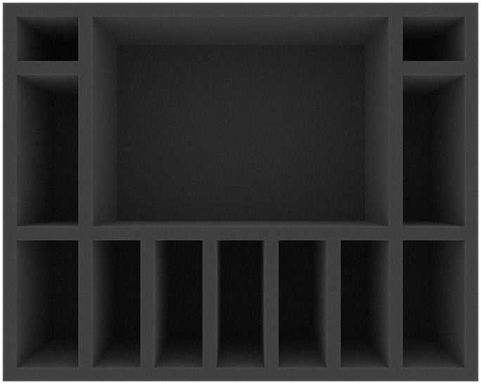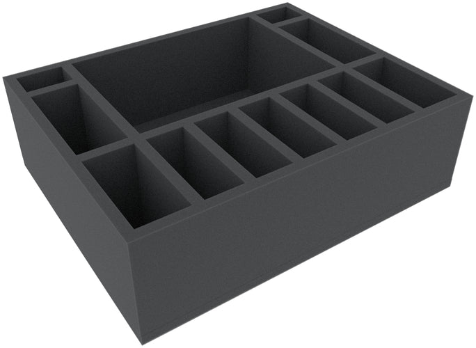This 105 mm high foam tray is divided into 12 compartments. It is particularly suitable for the safe storage of tabletop and board game miniatures, as well as other fragile models and small parts.