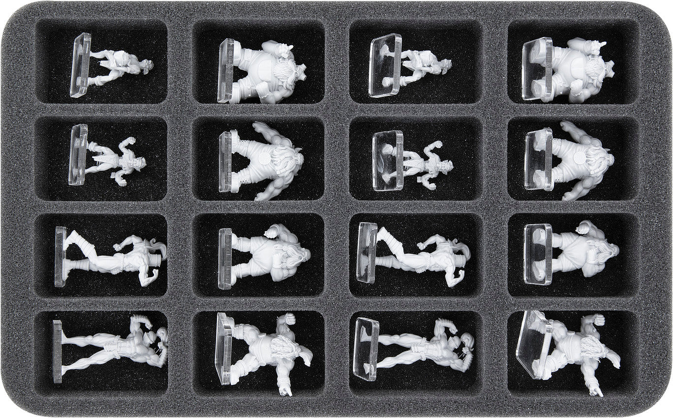 Don't worry, we have the right solution for your model athletes: This Feldherr Half-Size foam tray offers space for up to 16 miniatures on 25 mm bases. Thanks to the high-quality foam, you can transport your figures carefree to the next Rumbleslam event!