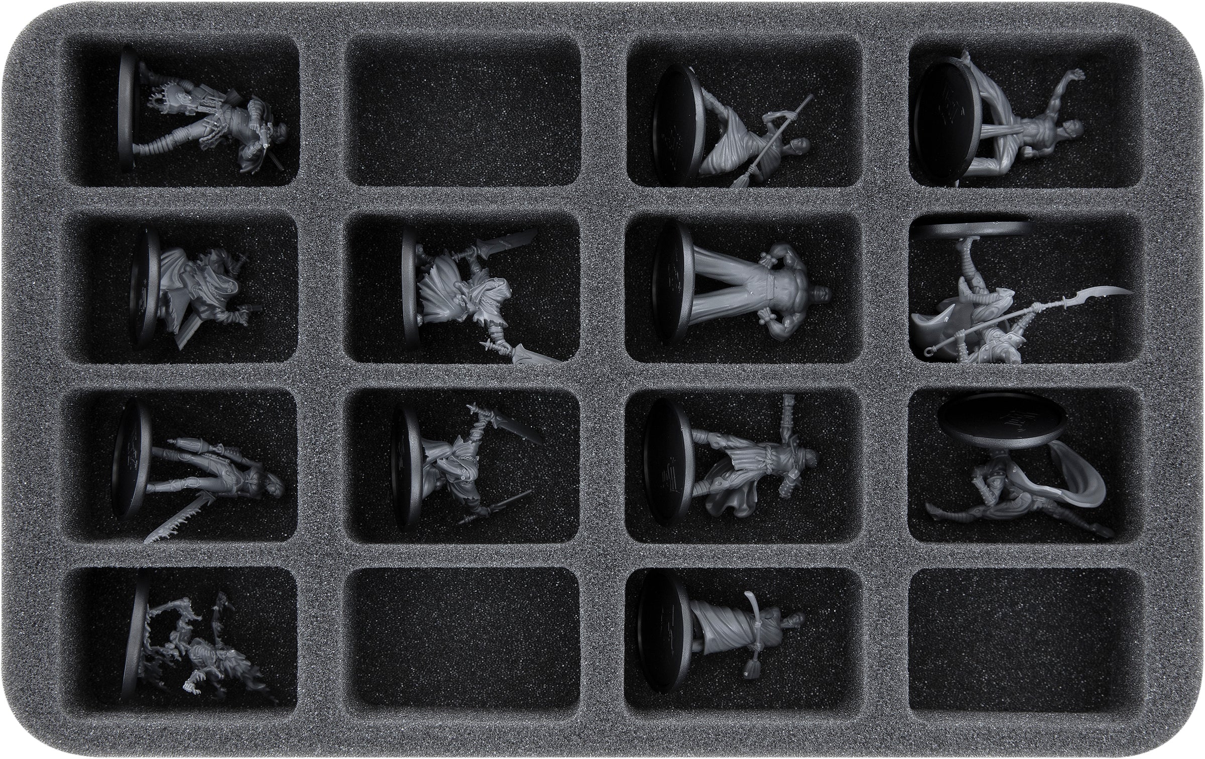 On this Feldherr Half-Size foam tray you have space for up to 16 miniatures of your crews. The insert is particularly suitable for storing models on 30 mm bases. The insert is ideal for example for the miniatures like of the Shenlong or Sonnia Core Box.