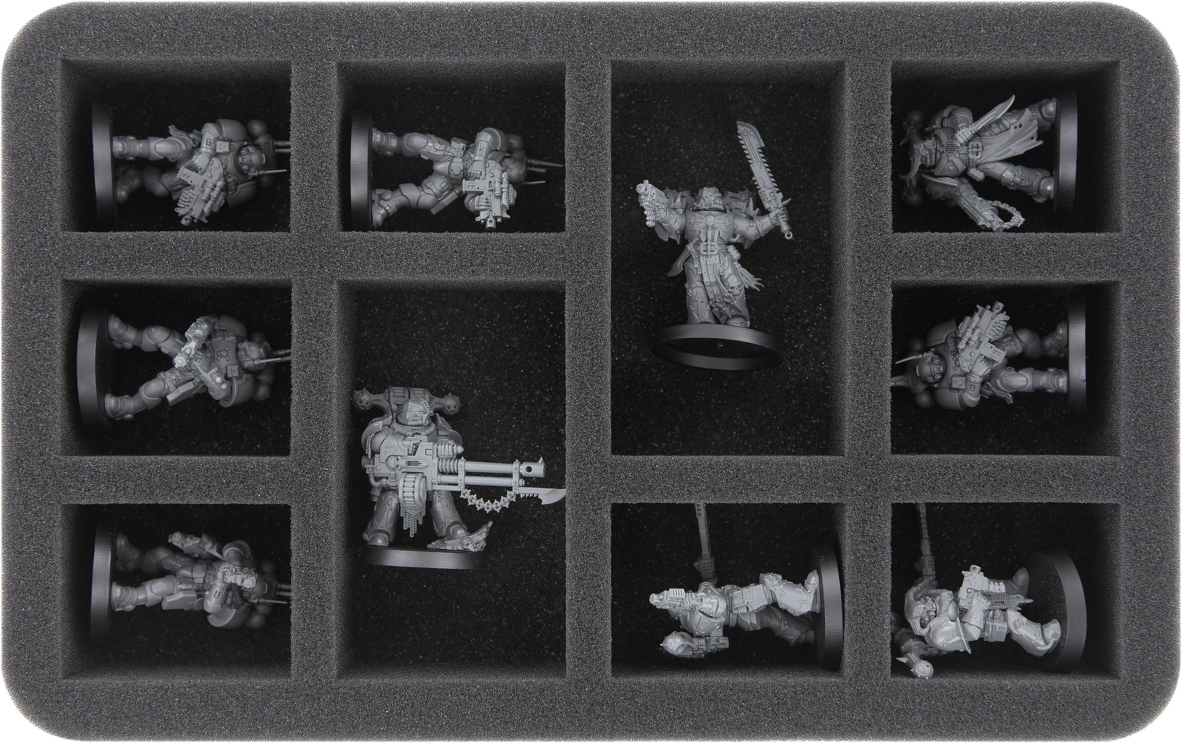 On this Feldherr foam tray you have space for up to 10 miniatures of your army. The insert is especially suitable for storing the standard infantry on 32 mm bases and infantry on 40 mm bases and similar sized models.