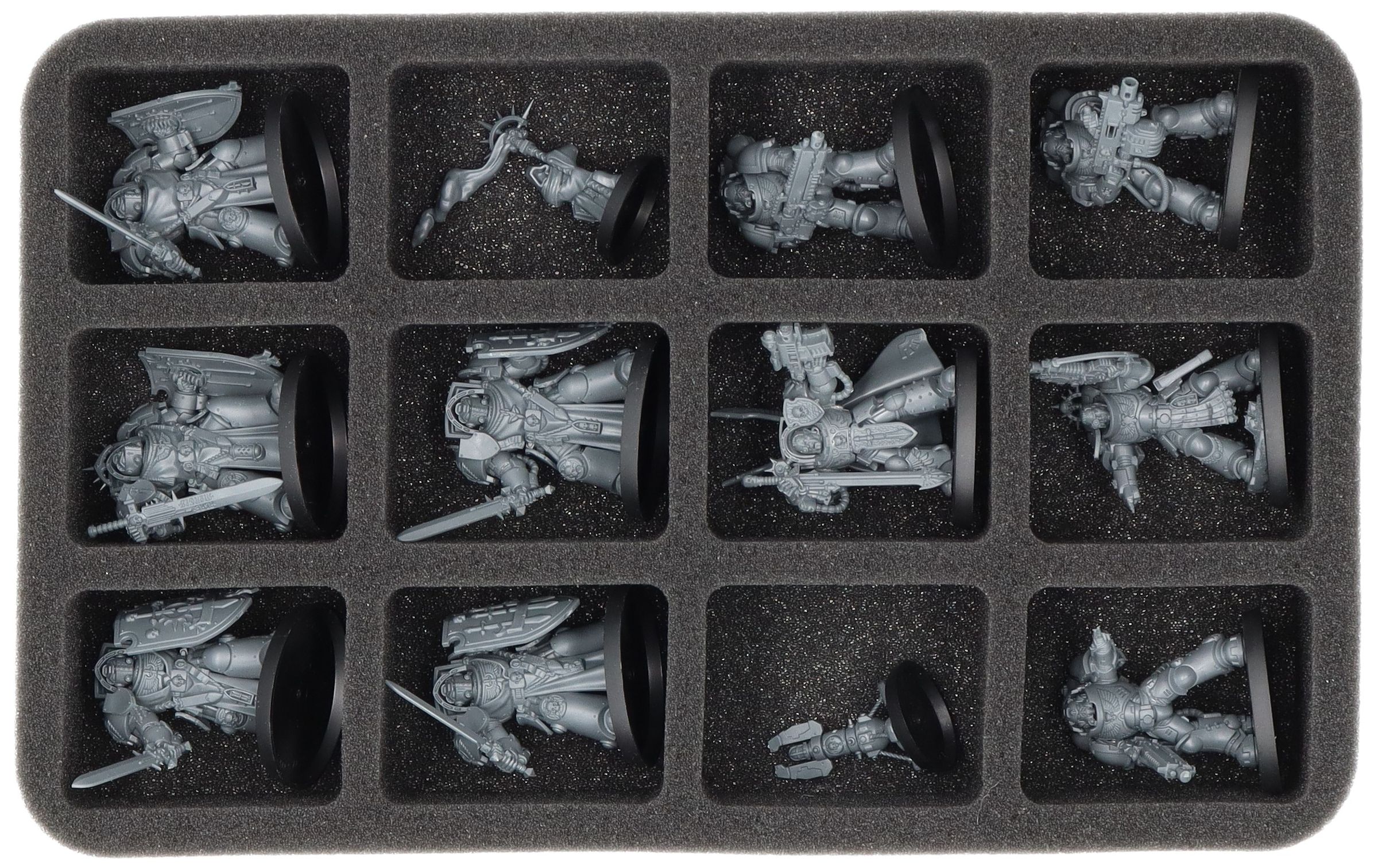 On this Half-Size foam tray you have space for up to 12 miniatures of your Space Marines army. The insert is ideal for Deathwing Knights, Terminators or Heavy Intercessors.
