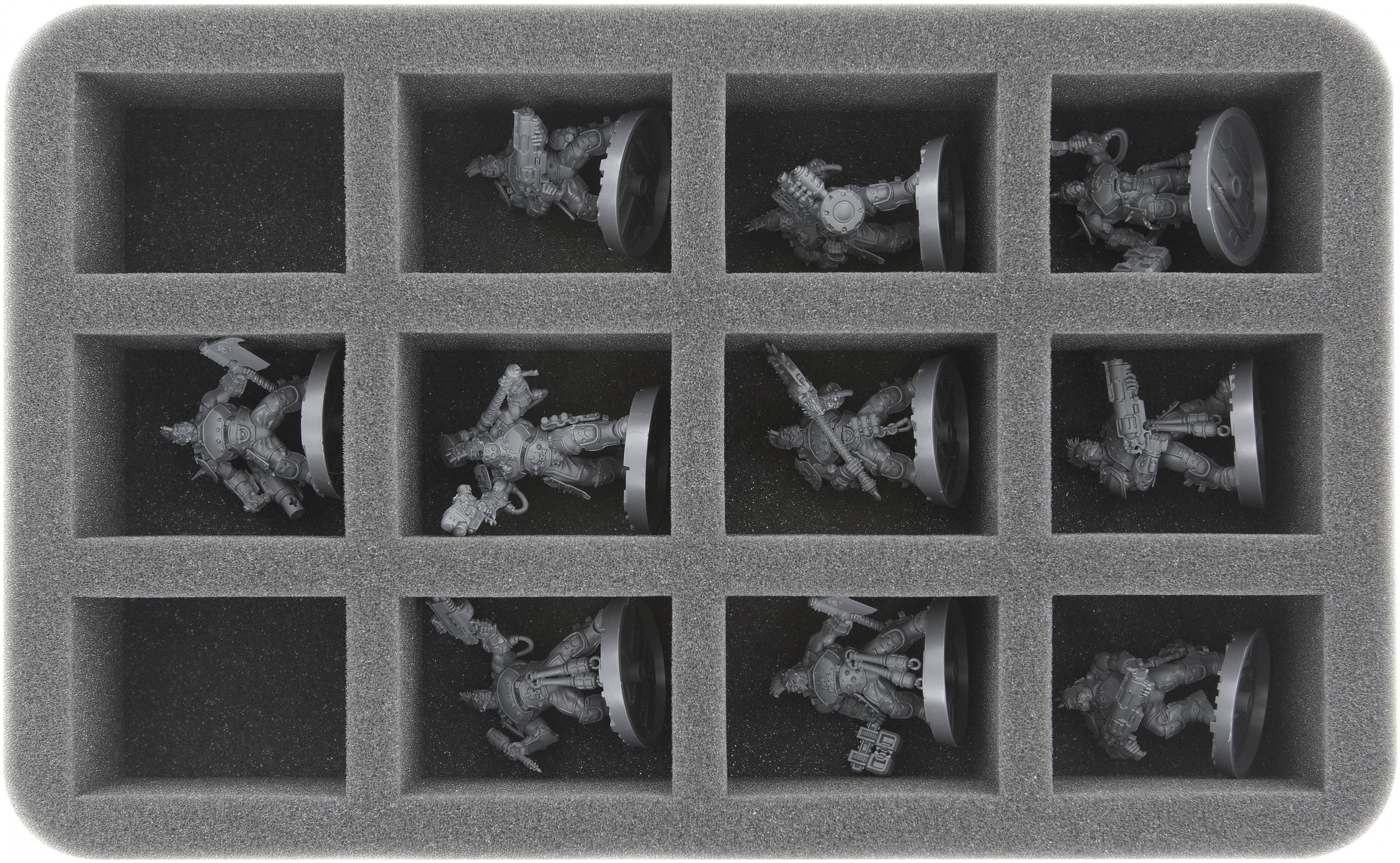 Foam tray with 12 compartments for the Goliath Gang from Necromunda: Underhive. Optimal protection for each gang member. Sensitive parts of the figures are protected from damage and the colors of painted models are preserved.