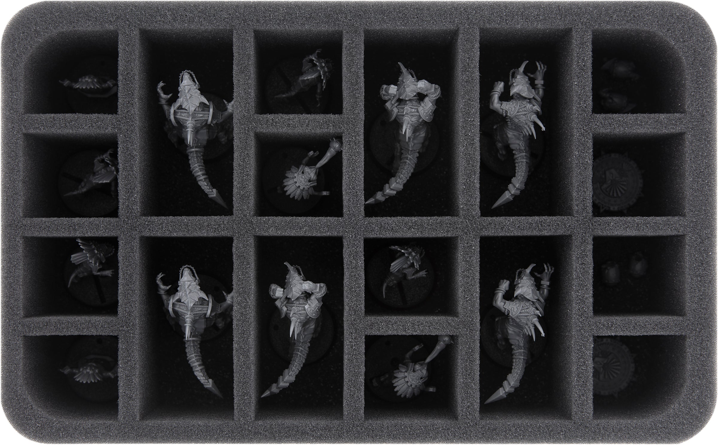 In the 18 compartments on this Feldherr Half-Size foam tray, each player on your Lizardmen team is assigned their own compartment. All 6 Saurus Blockers are accommodated in the oblong compartments, on the remaining small compartments you distribute 4 Skink Runners, 2 Chameleon Skinks, the two Slann statues, as well as the balls and team coins.