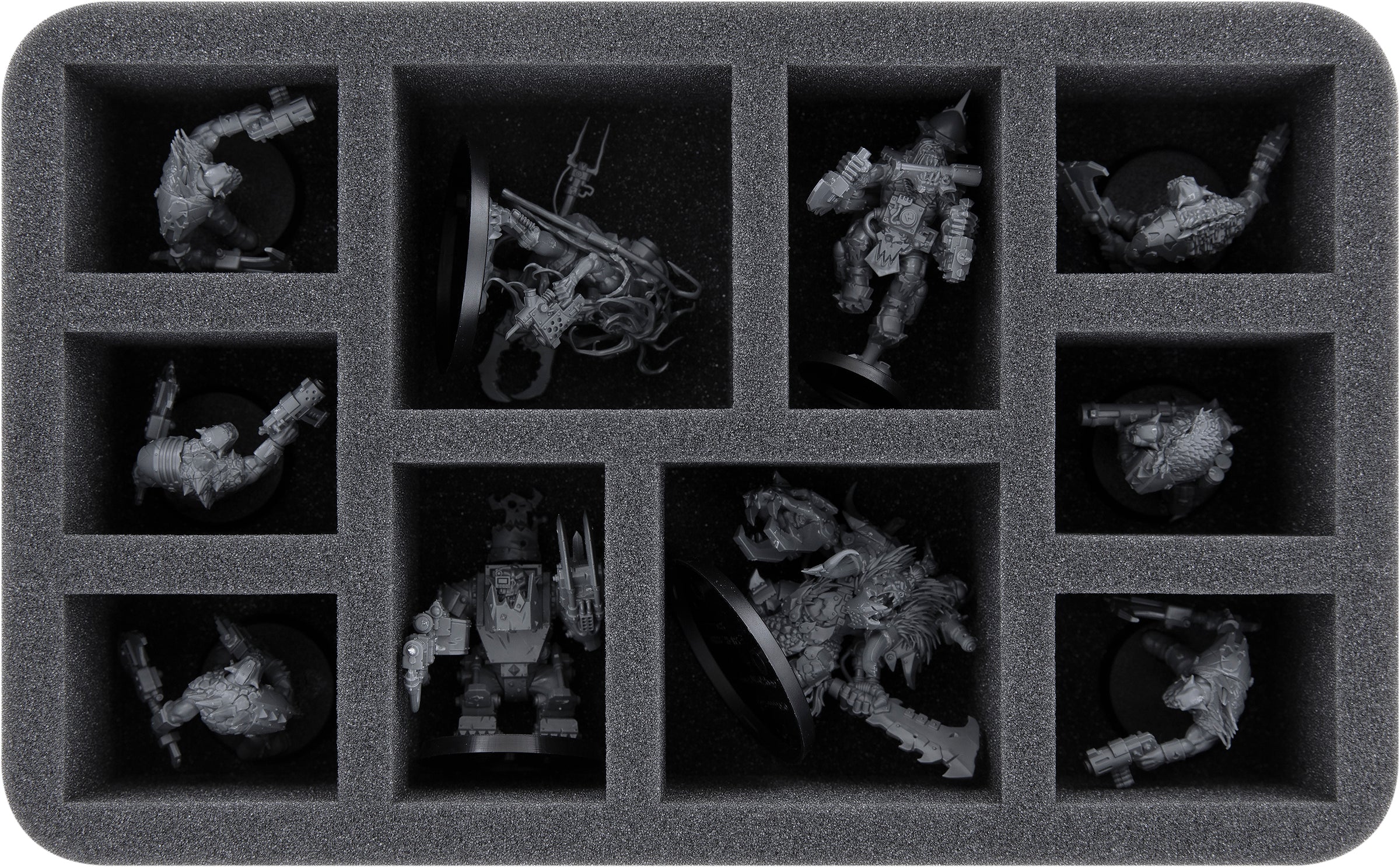 On this Feldherr foam tray you have space for up to 6 miniatures of your army. The insert is especially suitable for storing the Beastboss, Zodgrod Wortsnagga, Ork Stormboyz, Meganobz, Ork Beast Snagga Boyz, Ork Boys and similar sized models.