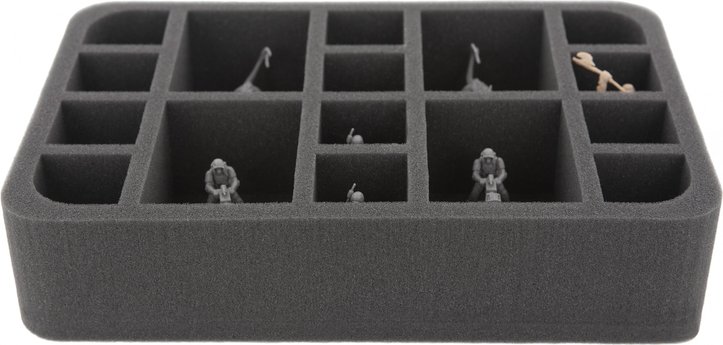 Perfect for 12 Storm Trooper / Jedi and 4 Nexu or E-Web Engineers on platform. This foam tray has 16 slots - each slot 50 mm deep. Ready to use - glued 10 mm foam base.