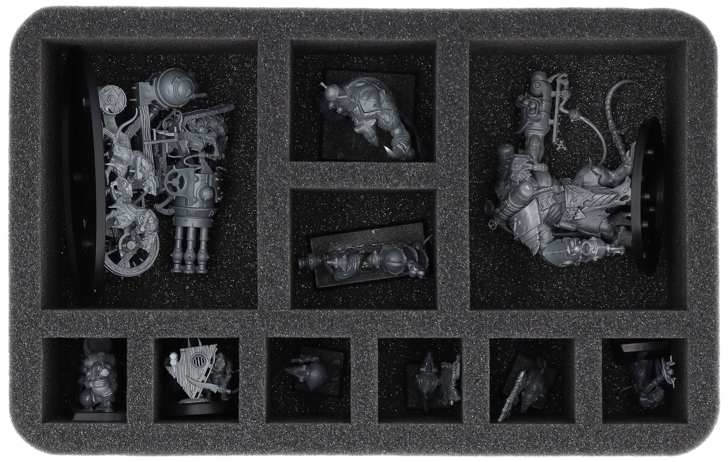 On this Feldherr foam tray you have space for up to 10 miniatures of your army. The insert is especially suitable for storing the Rat Ogors, Ratling Warpblaster and similar sized models.