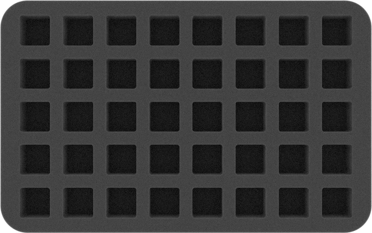 This foam tray has 40 compartments. It is ideally suited for the safe and orderly storage of D6 dice with a side length of 22.5 mm.