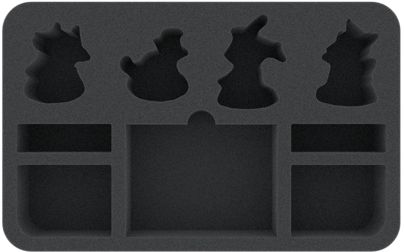 The custom-cut Half-Size foam tray offers a total of 9 compartments, for stowing the Stormcast Eternals miniatures and related game materials from the Starter Set. Miniature-precisely shaped compartments provide a safe retreat for Drakan Celestus, Aphus the Brave, Mellisan Star-Sighted, and Sleek the Gryph-Hound.