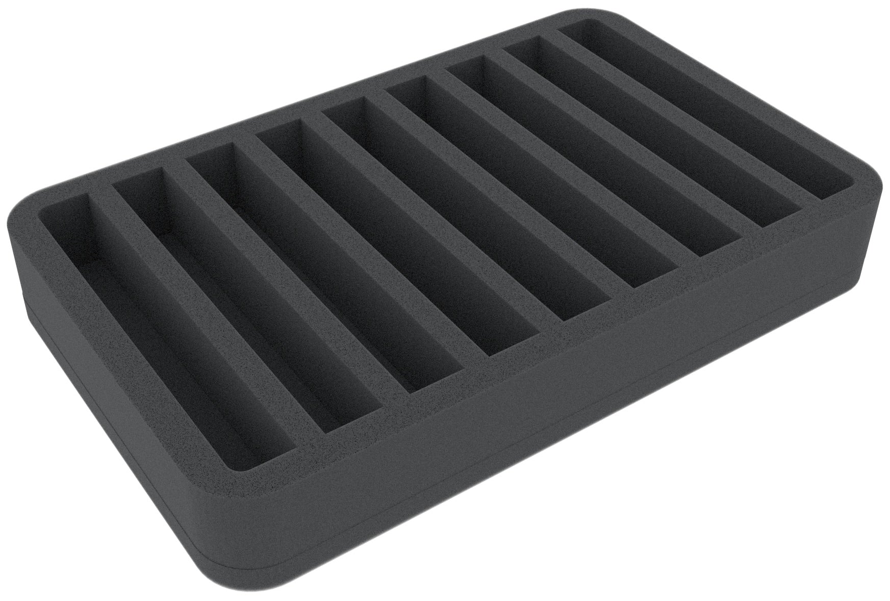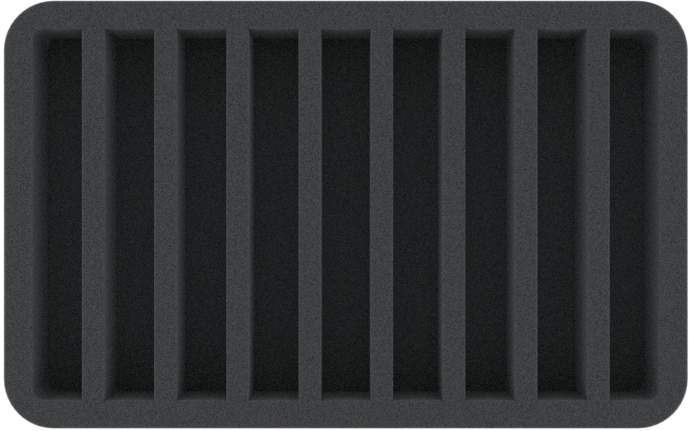 This 40 mm high foam tray is divided into 9 compartments. It is particularly suitable for the safe storage of tabletop and board game miniatures, as well as other fragile models and small parts.