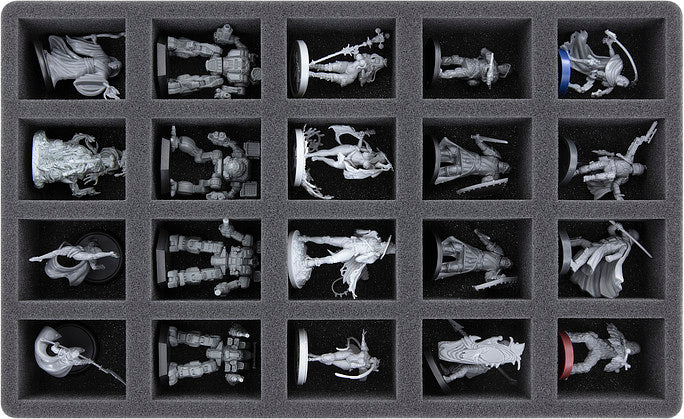 This 45 mm tall foam tray is divided into 20 compartments. It is particularly suitable for the safe storage of up to 20 miniatures on bases up to 35 mm. It doesn’t matter to which game system they belong. The set works reliably with miniatures from GamesWorkshop, Star Wars Legion, or Kingdom Death.