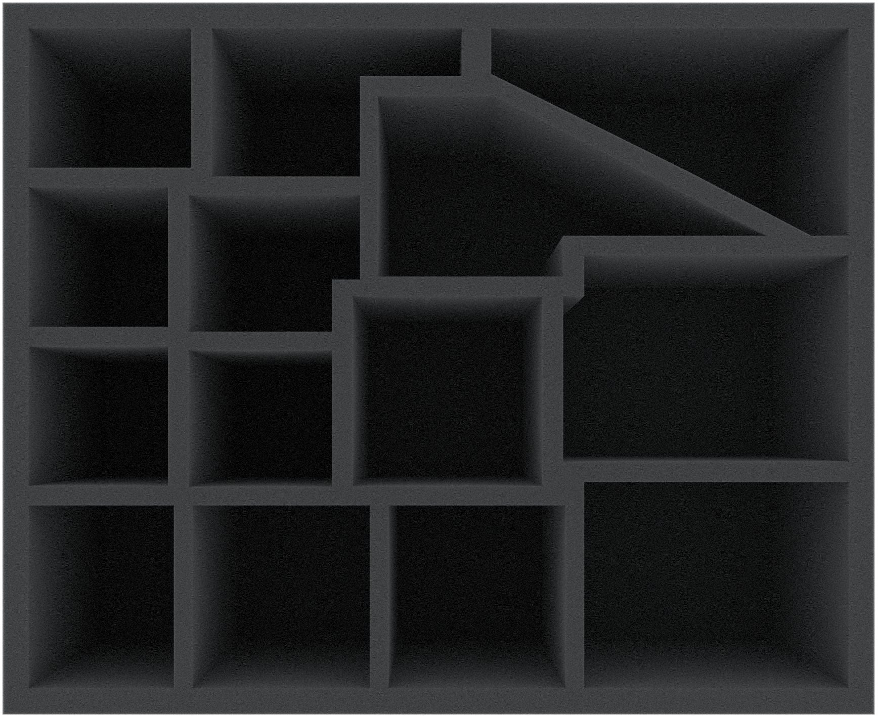 This 115 mm high foam tray is divided into 14 compartments. It is particularly suitable for the safe storage of tabletop and board game miniatures, as well as other fragile models and small parts.