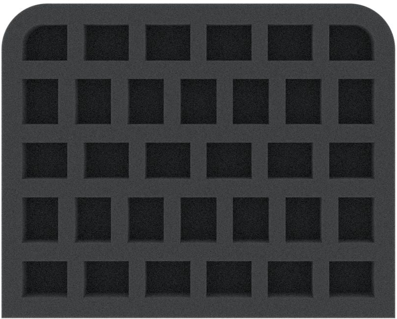 This 50 mm high foam tray is divided into 32 compartments. It is particularly suitable for the safe storage of tabletop and board game miniatures, as well as other fragile models and small parts.